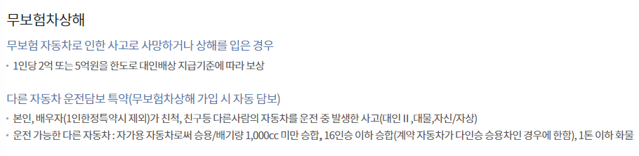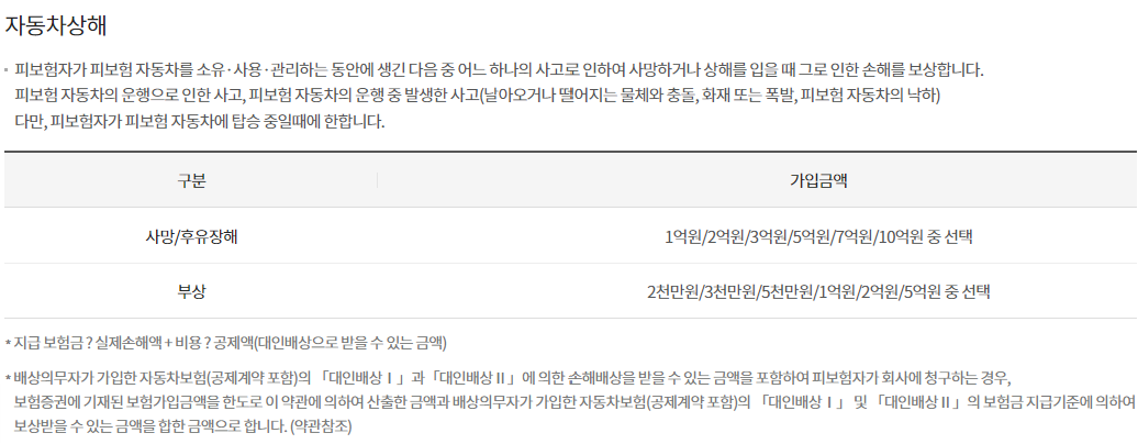 | 가입 대상 | 운전자 | 자동차 소유자 | | 가입 의무 | 선택 | 의무 | | 보상 대상 | 본인 | 상대방 | | 보상 내용 | 의료비, 장해금, 사망금 등 | 대인, 대물 피해 등 | | 적용 범위 | 차량 소유 여부와 관계없이 모든 차량 | 가입한 차량만 |