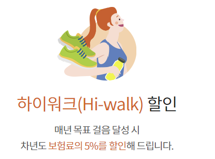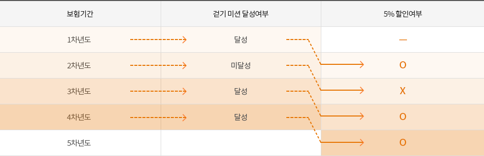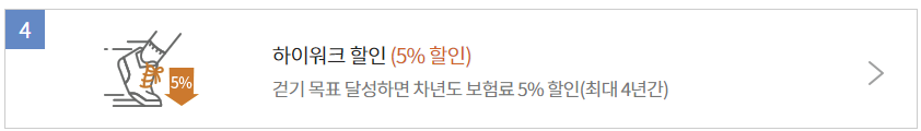 초년도 : 보험개시일 ~ 다음 계약해당일 전월 말일 / 2차년도 이후 : 계약해당일 당월 1일부터 1년 - 보험 계약 최초 4년동안 걸음수 측정이 가능하며 5차년도까지 최대 4년간 하이워크 할인이 제공됩니다.