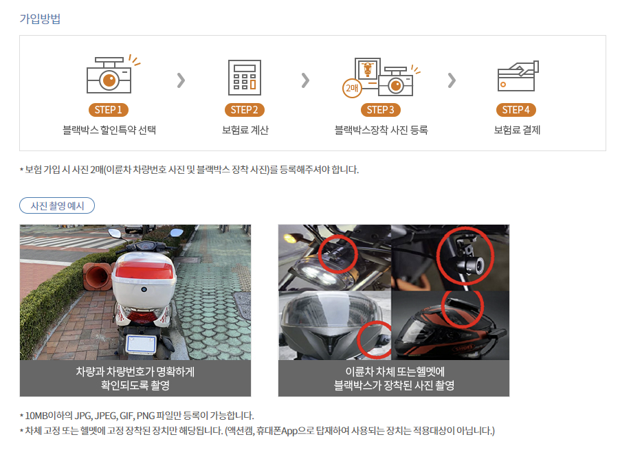 - 차량용 영상기록장치(블랙박스)가 장착된 차량 이륜차 특약할인 혜택을 드립니다.