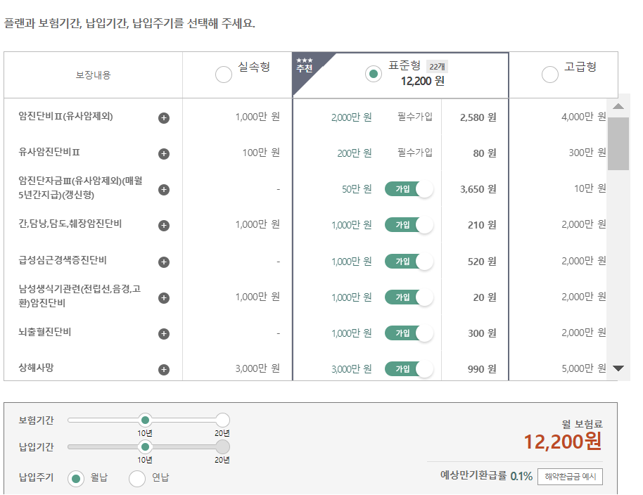플랜과 보험기간, 납입기간, 납입주기 등에 따라 보험료는 달라지며 플랜은 실속, 표준, 고급형이 있고 선택에 따라 보장 갯수와 보장한도가 달라집니다. 그래서 직접 보장받고 싶은 부분을 선택하시면 됩니다.
