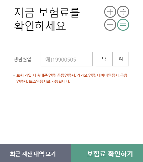 보험료 조회는 생년월일 선택 후 보험료 확인하기를 클릭하면 운전형태 및 직업 정보를 입력하시면 됩니다.