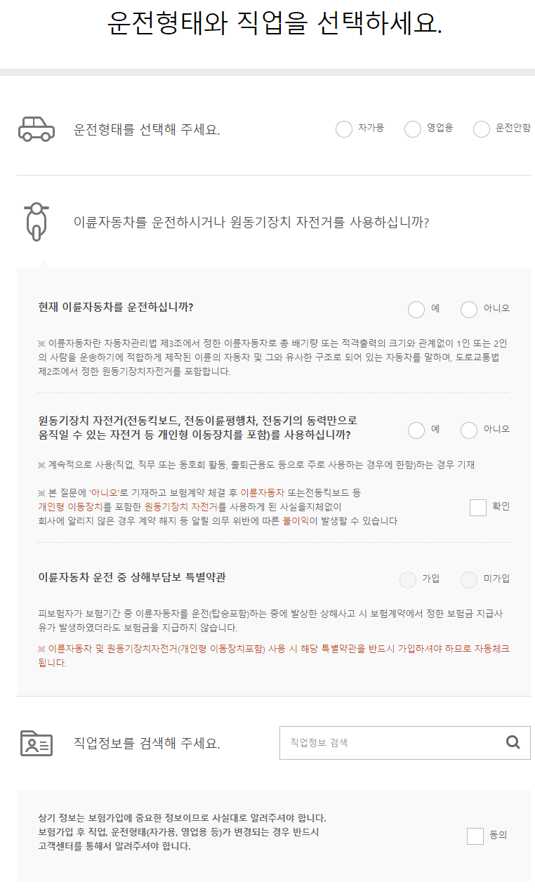 운전형태는 자가용으로 이륜차는 운전안함, 직업은 회사 사무직으로 입력했습니다.