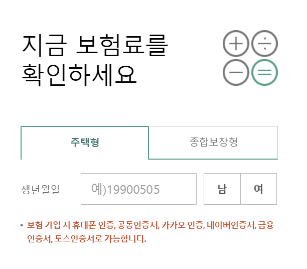 주택형, 종합보장형 중 선택 후 생년월일 성별을 입력합니다.