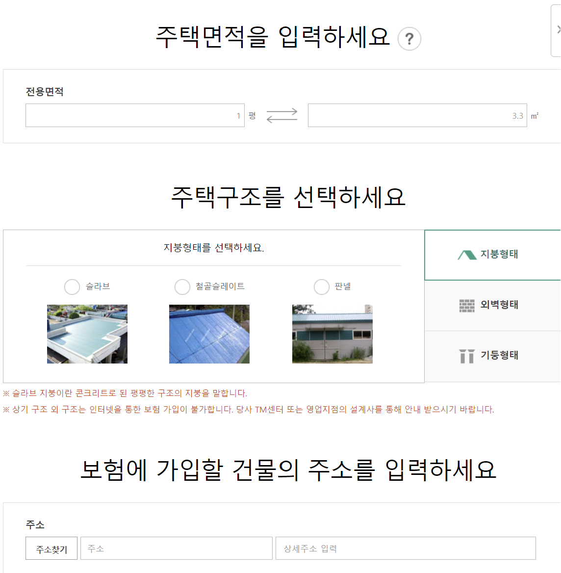 주택의 면적, 형태 , 건물 주소 등을 입력하면 보험료가 산출됩니다.