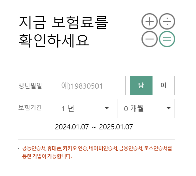 보험료 조회는 간편하게 가능합니다. 우선 생년월일과 보험기간을 입력합니다.
