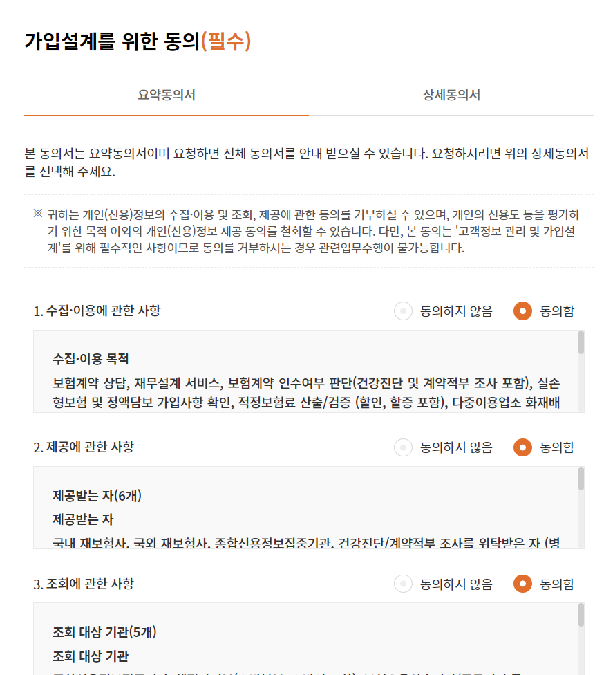 그 다음 가입설계에 관한 정보 동의를 합니다.