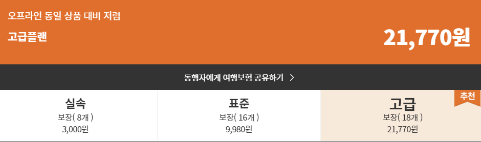 표준과 고급은 보통 선택 보장 선택 유무에 따라 달라지며 직접 보험료를 조회해보시면서 해외여행보험 가입 하시는 것을 추천드립니다.
