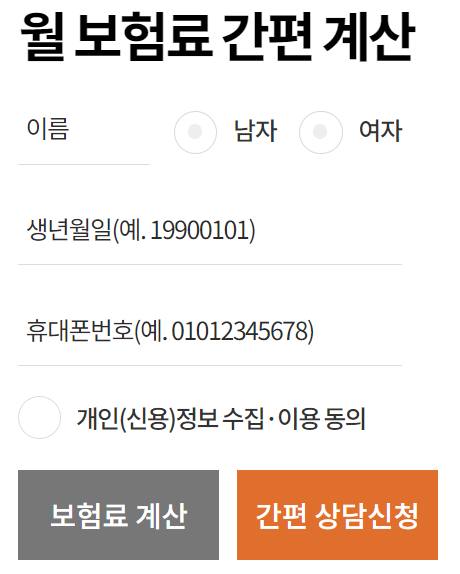 먼저 이름 성별 생년월일 휴대폰 번호 입력 후 개인정보 수집 이용 동의를 하고 나면 보험료를 바로 계산할 수 있습니다.