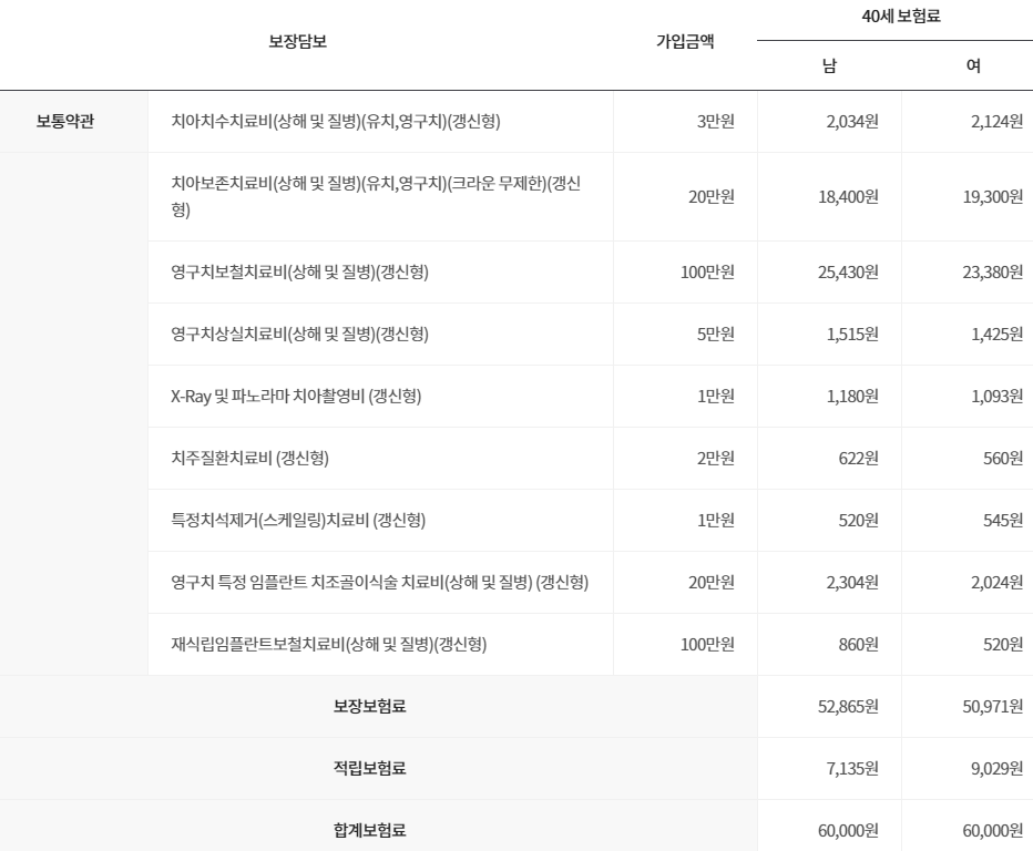 - 진단형 치아보험: 치아상태를 진단받아야 가입 가능하고, 면책기간 있음. 하지만 보장금액이 크고, 감액기간이 없음.