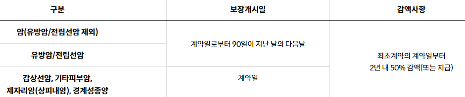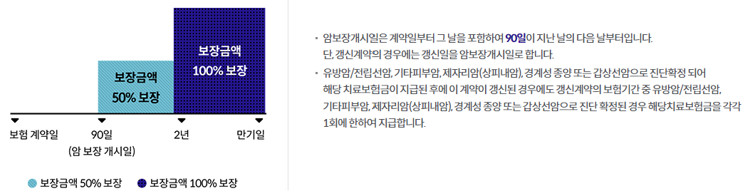 - 2. 암보장개시일은 최초계약의 경우 계약일부터 그 날을 포함하여 90일이 지난 날의 다음 날로 하고 갱신계약의 경우 갱신일로 합니다. 다만, 부활(효력회복)계약의 암보장개시일은 부활(효력회복)일을 포함하여 90일이 지난 날의 다음 날로 합니다.