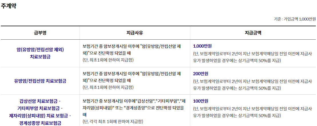 - 7. 주) 4에도 불구하고 갱신계약의 보험기간 중 유방암, 전립선암, 기타피부암, 제자리암(상피내암), 경계성종양 또는 갑상선암으로 피보험자에게 약관 제6조(보험금의 지급사유)의 보험금 지급사유가 발생하더라도, 그 지급사유가 최초계약의 보장개시일 이후 이미 보험금이 지급된 유방암, 전립선암, 기타피부암, 제자리암(상피내암), 경계성종양 또는 갑상선암과 동일한 경우(이미 보험금이 지급된 질병의 종양세포가 잔존하거나 재발 또는 전이된 경우) 회사는 해당 치료보험금을 지급하지 않습니다.
