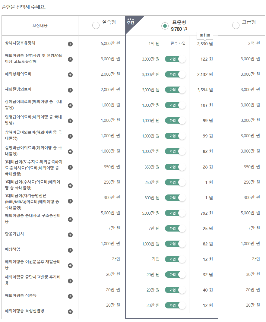보험료는 사람마다 다르고 여행기간, 플랜(실속, 표준, 고급형)에 따라 달라지므로 실제로 조회해보면서 비교해보시기 바랍니다.