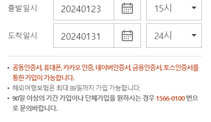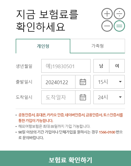 우선 생년월일, 성별, 출발, 도착 일시를 입력하고 보험료 확인하기를 클릭합니다.