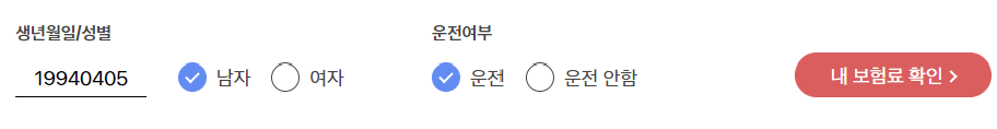 생년월일 및 성별입력 운전여부 입력 후 내 보험료 확인을 클릭합니다.
