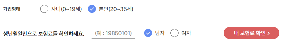 먼저 자녀를 가입 시킬 것인지, 본인이 가입할 건지 선택 후 생년월일 ,성별을 입력하고 내 보험료 확인을 클릭합니다.