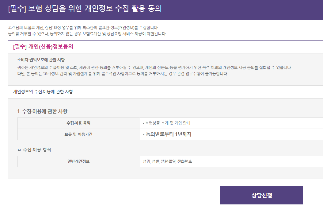 보험 상담을 위한 개인정보 수집 활용 동의를 클릭합니다.