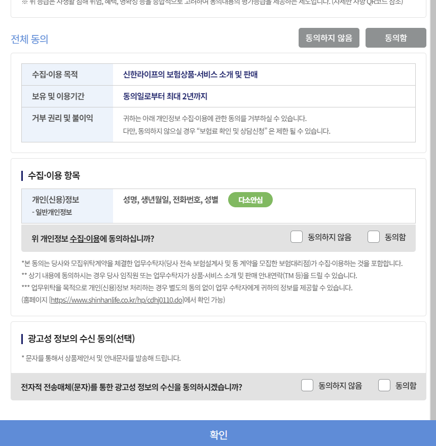 보험료 계산을 위한 개인정보 수집 이용에 동의를 해주시고 광고성 정보의 수신 동의는 선택 사항이기 때문에 동의하지 않으셔도 됩니다. 확인을 클릭하면 아래와 같이 보험료가 계산됩니다.