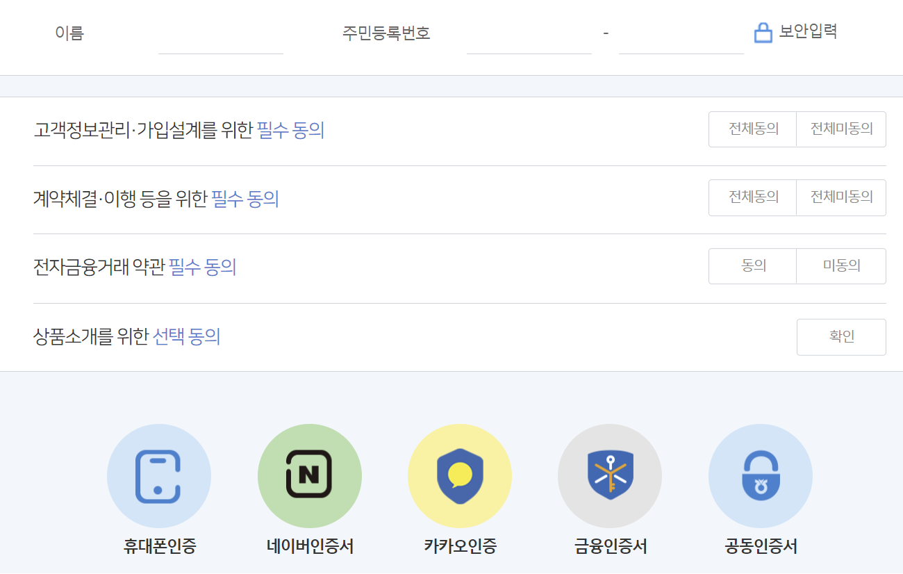 성함, 주민등록번호 입력 후 필수 동의에 동의 후 인증서를 통해 가입을 진행하면 됩니다.