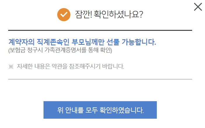 보험료 조회방법은 간단합니다. 보험료는 지정되어 있으며, 아버지, 어머니 중 선물하고 싶으신 분을 선택 후 선물하기를 클릭합니다.