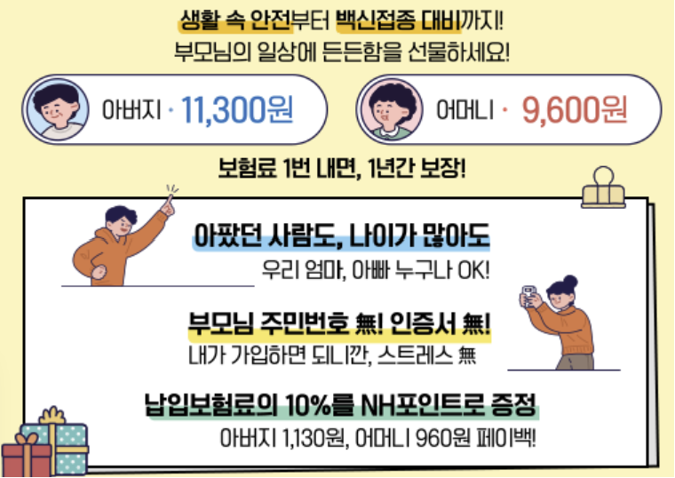 NH농협생명 효밍아웃 부모님안전보험 보장내용 혜택 보험료 조회방법 등 NH농협생명의 부모님안전보험에 대해 알아보겠습니다. 이 상품은 농협생명이 만든 부모님안전보험으로 선물 하는 방식으로 부모님을 가입시켜드리는 상품입니다.