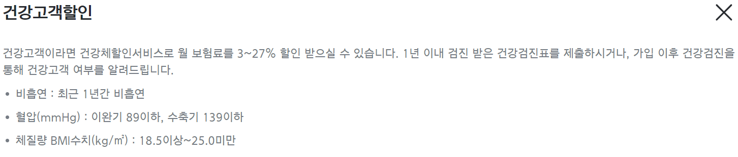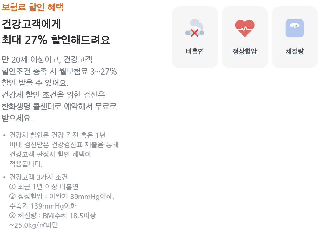 보험료는 만기환급형, 순수보장형, 직접설계형이 있으며 보험기간, 납입기간, 보장금액, 나이, 성별 등 여러 조건에 따라 달라지며 아래 조건에 부합한다면 건강고객할인 혜택을 받을 수 있습니다.