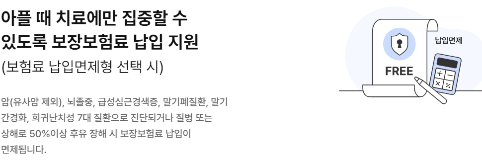 - 상기 가입예시는 이해를 돕기 위한 것으로 기본계약 이외의 선택특약은 자유롭게 선택하여 가입할 수 있습니다. 다만, 피보험자의 직업, 직무, 기타사항으로 인하여 인수가 제한적이거나 불가능할 수 있습니다.