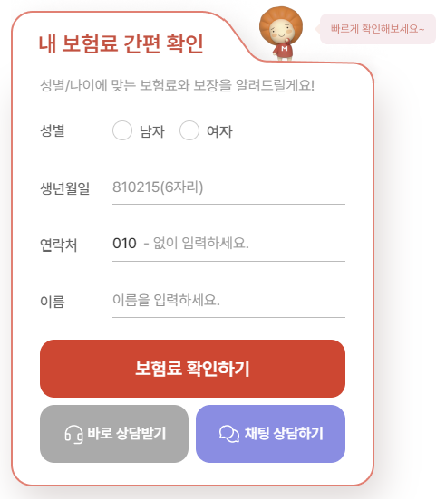 보험료 조회방법은 간단합니다. 성별, 생년월일, 연락처, 이름을 입력하고 보험료 확인하기를 누릅니다.