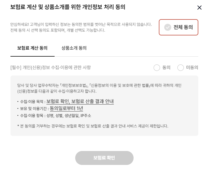 상품소개를 위한 개인정보 처리는 미동의 눌르셔도 됩니다. 누른 후 보험료 확인을 누릅니다.