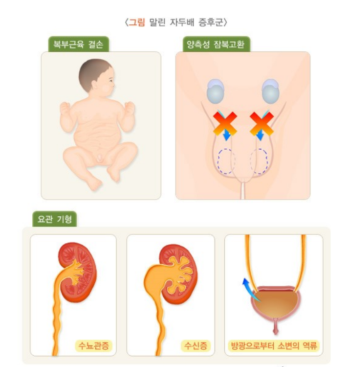 복부 근육이 부분적 또는 전체적으로 결손 되어 있으며, 고환이 음낭 쪽으로 내려오지 않은 잠복고환, 요관의 기형이 특징적으로 나타나는 희귀 질환입니다.