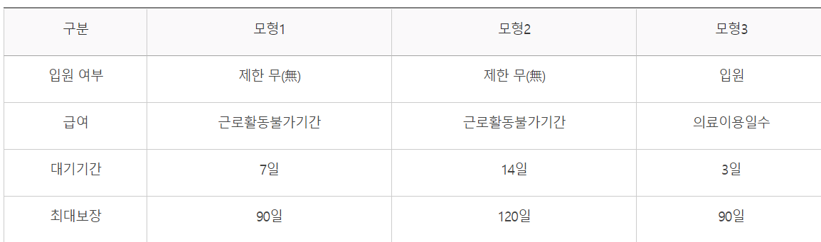 첫 번째 모형은 입원 여부는 필요 없고 대기기간은 7일이며, 1년 이내 최대 90일까지 급여 지급이 보장됩니다.