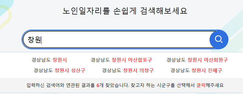 창원시를 검색해보면 총 2379건의 노인일자리가 검색되며 유형별로 나누어서 보고 싶다면 위의 체크 표시를 통해 유형별로 나누어서 확인 하실 수 있습니다.