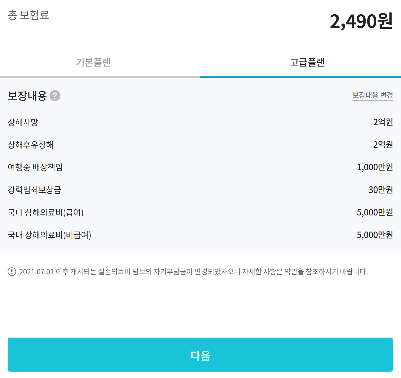 성별 생년월일 입력 후 다음을 누릅니다. 그럼 다음과 같이 보험료가 계산됩니다.