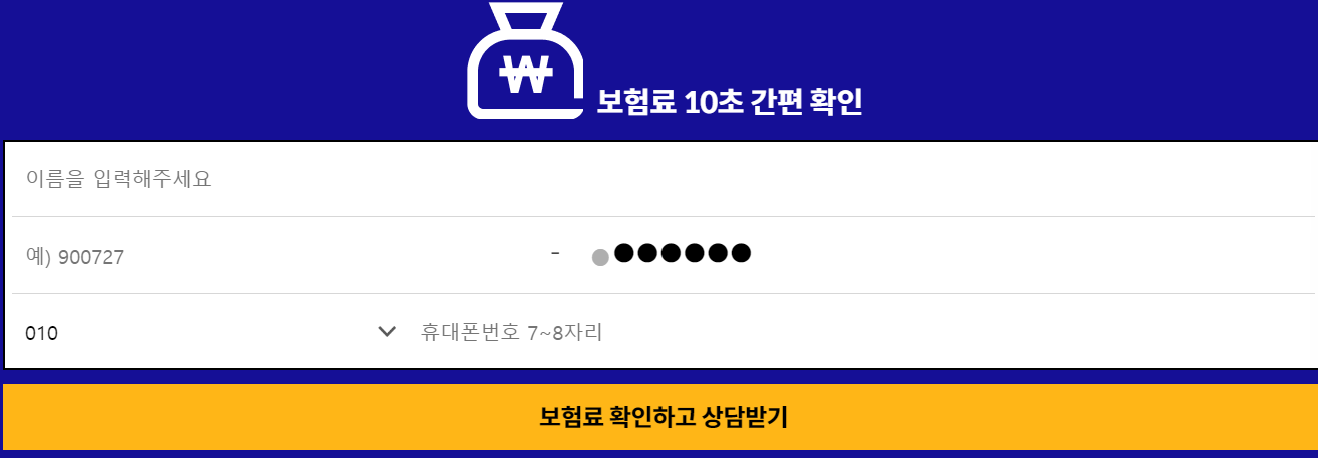 이름, 생년월일, 성별 ,휴대폰 번호 입력 후 보험료 확인하고 상담받기를 클릭합니다.