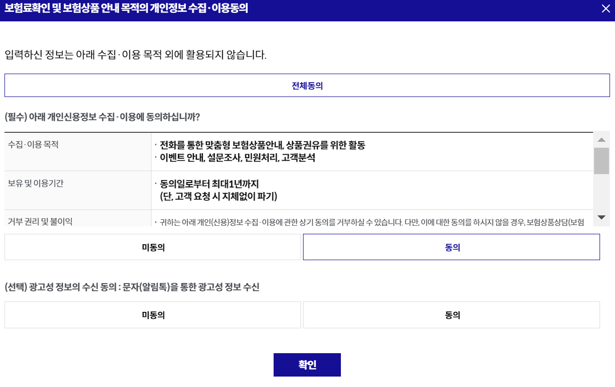 보험료 계산을 위한 동의를 해주면 바로 다음과 같이 보험료가 계산됩니다.