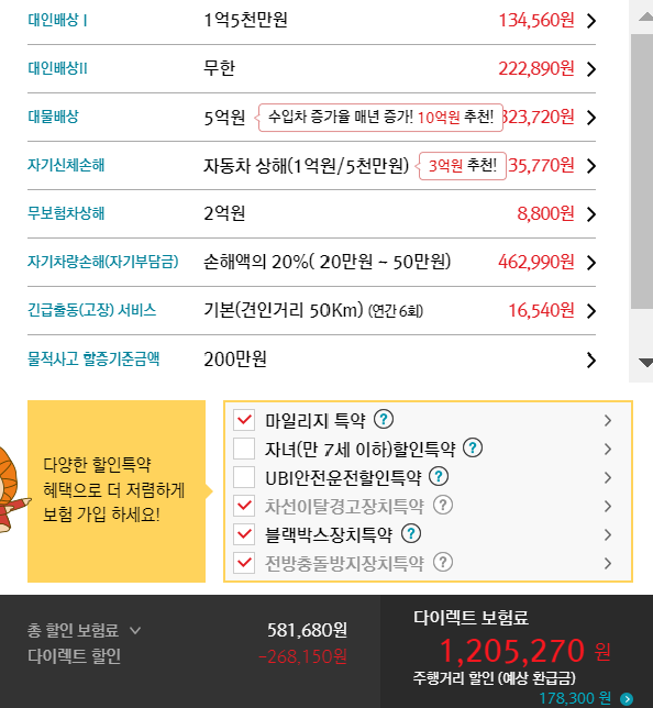 보험료는 자신이 원하는 보장금액에 따라 보험료가 가감되며 각종 할인특약 해당 여부 등 여러 조건에 따라 달라지므로 직접 조회해보시면서 보험료 계산해보시기 바랍니다.