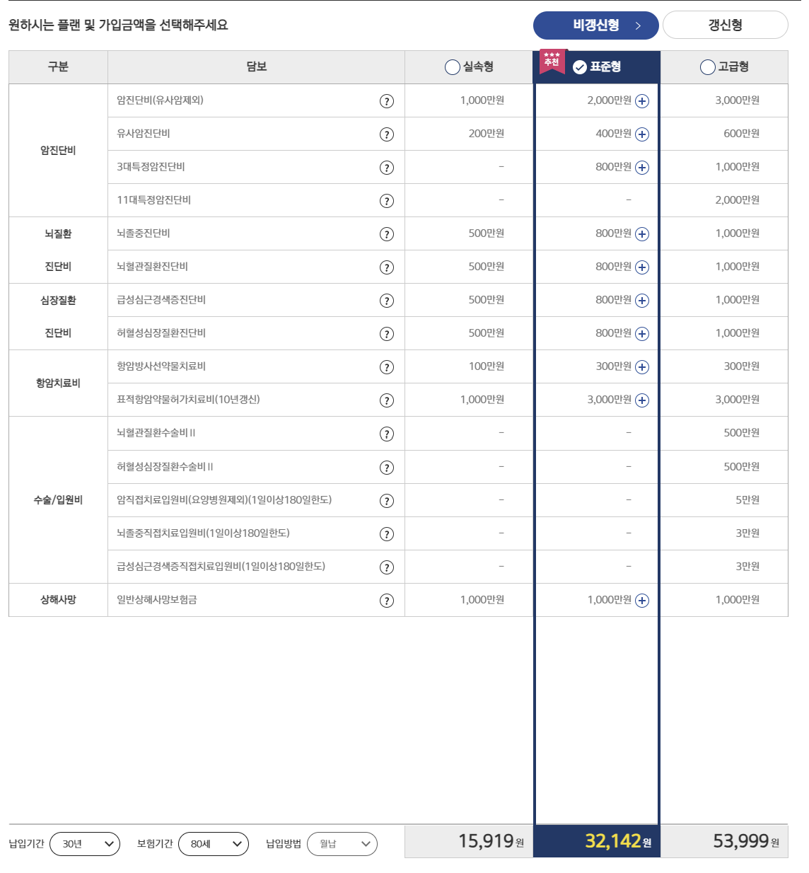 보험료는 납입기간, 보험기간, 납입방법, 갱신여부 등 다양한 조건에 따라 달라지므로 직접 조회해보시면서 어떤 보장이 얼마만큼 금액을 보장해주는 지 체크해보시기 바랍니다.