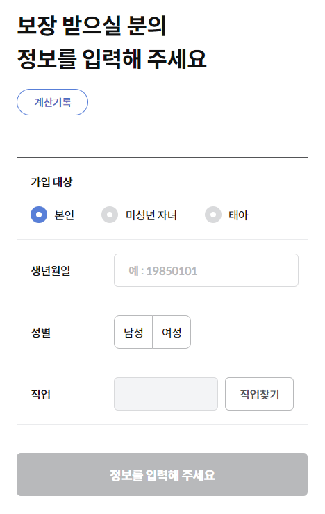 가입대상, 생년월일, 성별 및 직업 정보를 입력하면 아래와 같이 보험료가 계산됩니다.