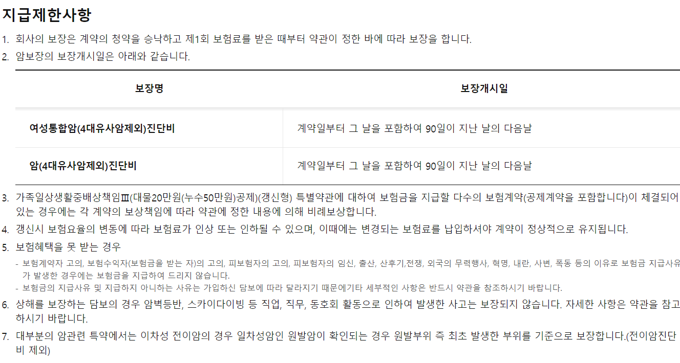 3. 면책 기간: 대부분의 건강보험에는 면책 기간이 설정되어 있으며, 이 기간 동안은 보장을 받을 수 없습니다. 특히 여성건강보험의 경우, 임신 관련 보장에 면책 기간이 적용될 수 있으니 가입 전에 반드시 확인해야 합니다.
