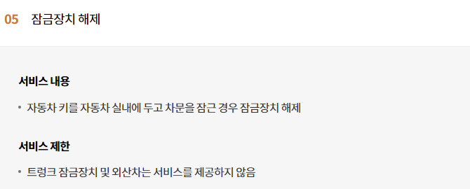 - 제공서비스: 배터리 방전 시 시동서비스 / 잠금장치해제서비스 / 비상급유에 한하여 제공