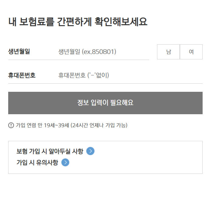 먼저 생년월일 휴대폰 번호 성별 입력 후 보험료 계산을 클릭합니다.