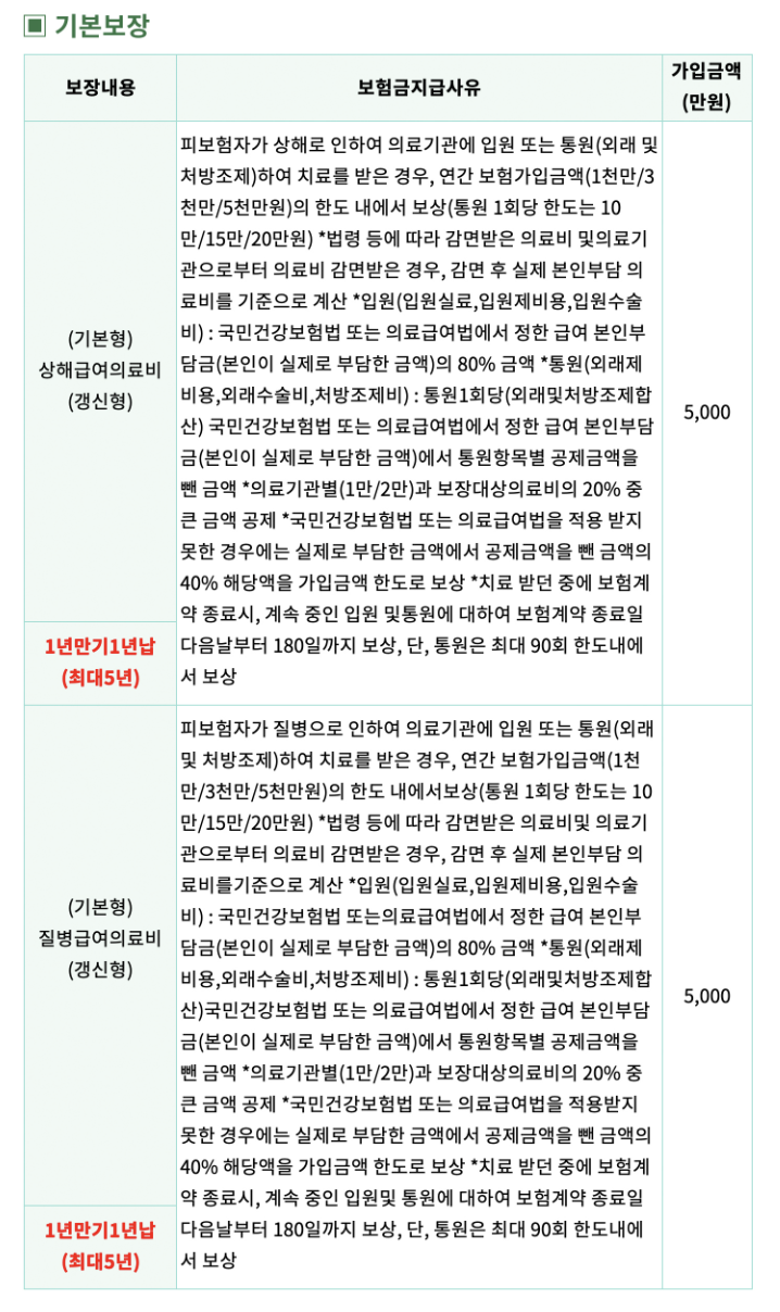 | 입원 의료비 | 병실료, 수술비, 처치비 포함 | 연간 5,000만 원 |