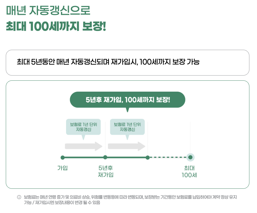 - 1년 단위 갱신, 최대 100세까지 보장