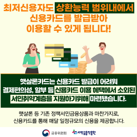 미소금융 햇살론 카드는 신용카드 발급이 어려워 할부 및 포인트 등 이용혜택에서 소외된 저신용자 분들을 위해 금융상품 선택권을 확대하고 건전한 소비로 이어질 수 있도록 신용카드 발급을 지원하는 사업입니다.