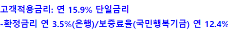 이 상품의 대출 금리는 은행금리 3.5% + 국민행복기금 보증료율 12.4%를 더해 연 15.9%입니다.
