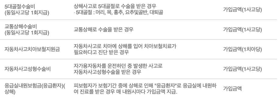 - 운전 중 사고로 인한 치료비나 입원비에 대해 최대 1천만원까지 보장합니다.
