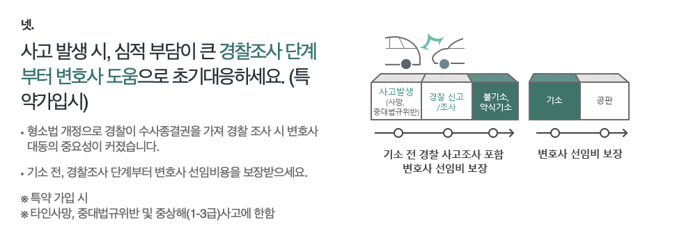 - 운전중 사고로 인한 법률상담, 변호사 선임비용, 소송비용 등에 대해 최대 1천만원의 보장금액을 지급합니다.