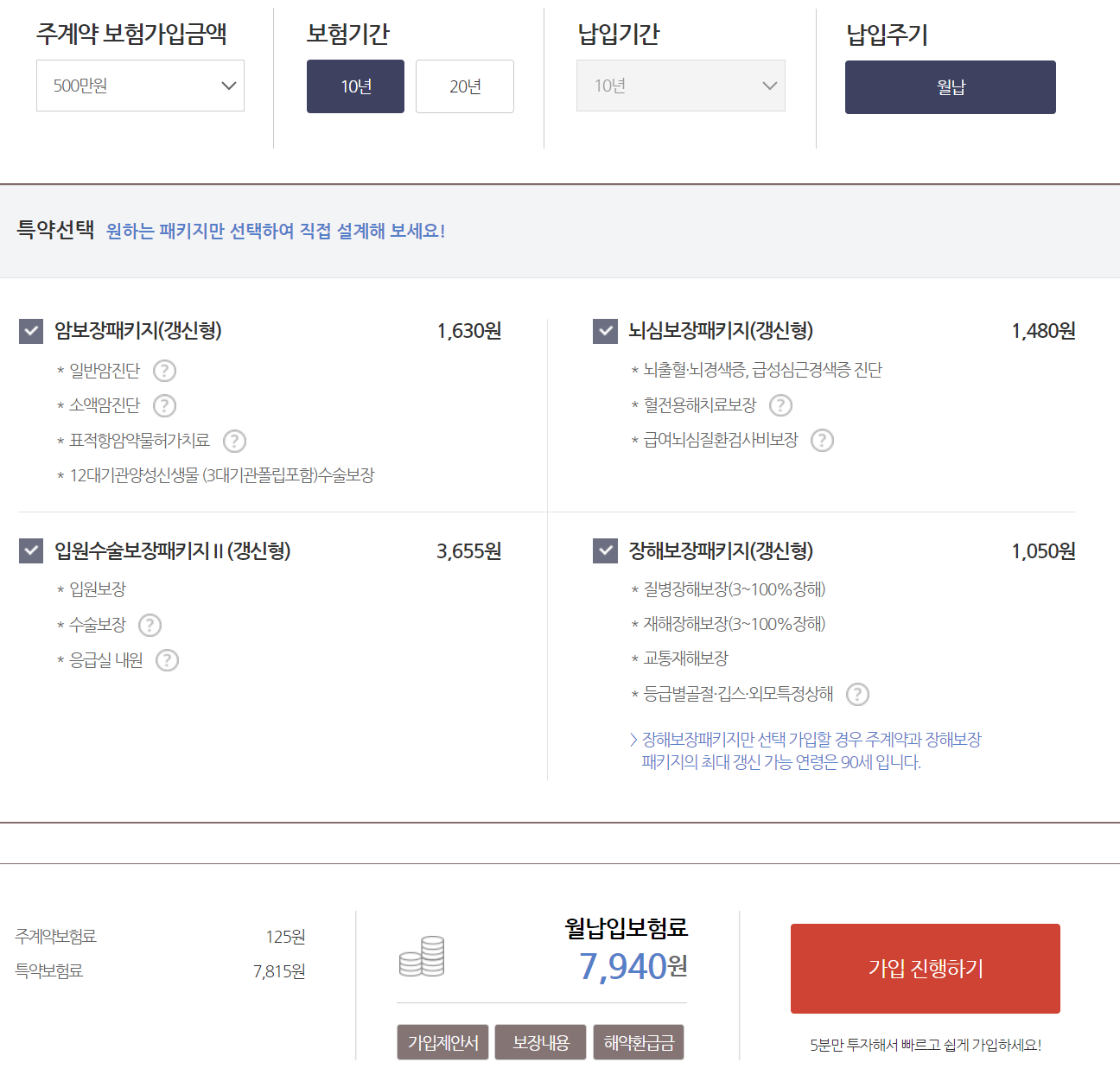 보험료는 사람마다 다르고 보험가입금액, 보험기간 및 패키지 선택에 따라 다르므로 직접 조회해보시기 바랍니다.