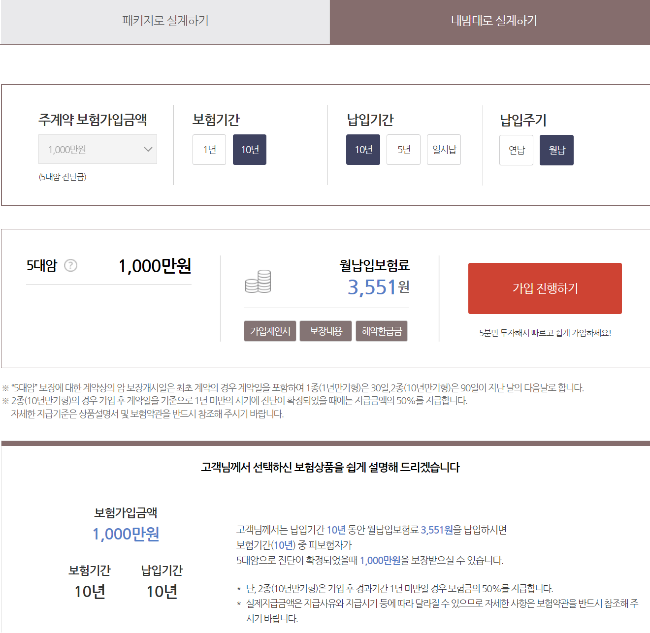 보험 상품은 패키지로 설계 또는 내맘대로 설계가 있으며, 보험료는 나이, 성별, 보험기간, 납입기간, 주기 등 여러 조건에 따라 달라지므로 직접 조회하면서 알아보시기 바랍니다.