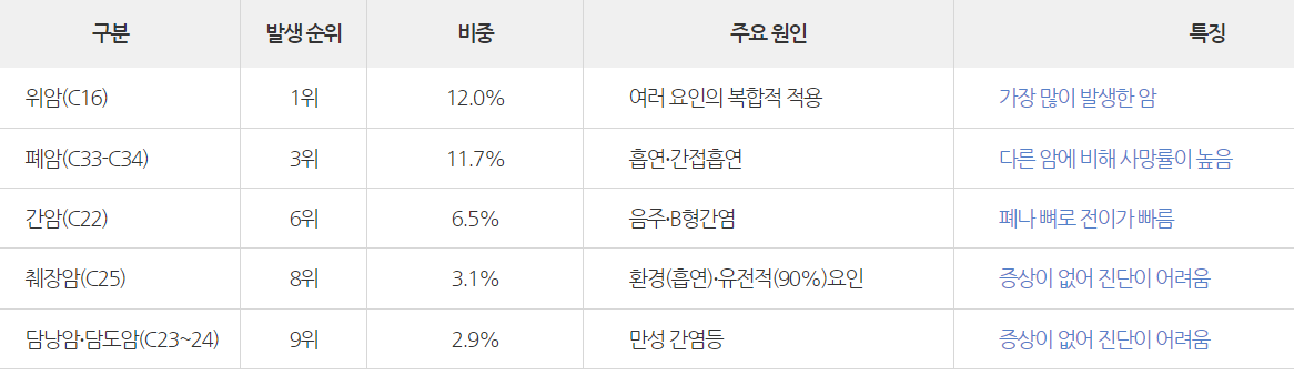 - 이 계약에 있어서 “5대암”이라 함은 제8차 개정 한국표준질병·사인분류 중 위암, 간암, 폐암, 췌장암, 담낭암 및 기타담도암으로 “5대암 분류표”(약관 별표2 참조)에서 정한 질병을 말합니다.
